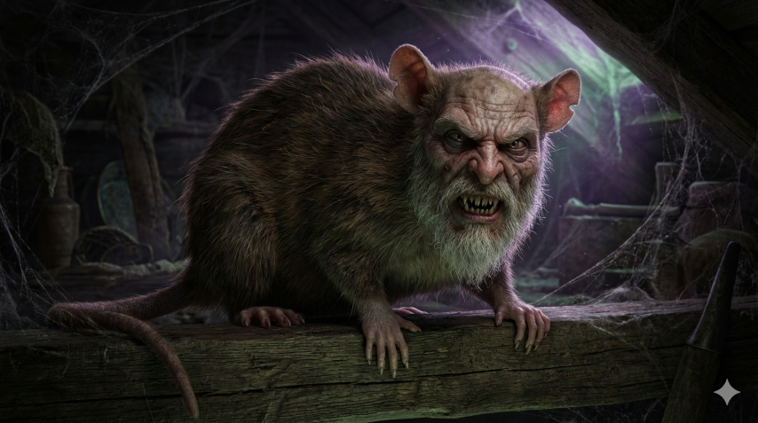 "Era una rata grande, pero tenía un rostro barbudo con aspecto extrañamente humano. Los dientes amarillentos sobresalían de la barba blanca, y sus diminutas garras eran horriblemente parecidas a manos humanas."